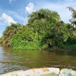 Im Programm waren Zwergflusspferde und Krokodile angekündigt. Die Erfahrung aus Waldelefanten- und Schimpansen-Treckings lehrte uns allerdings, dass wir wieder leer ausgehen werden und wenig erwarten sollten. Und in der Tat sahen wir am Ufer von Tiwai Island lediglich drei Ibisse schimpfend davon fliegen, als wir ihren Standbaum passierten.