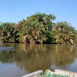 Auf nach Westen. Nach dem Frühstück tuckerten wir etwa 8:30 Uhr mit dem Motorboot, 12 Insassen und dem gesamten Gepäck über den Fluss nach Kambama. Der Regen hatte die Luft gereinigt, die Oberfläche des Moa war glatt und glänzte in der Morgensonne. Die leicht wippenden Palmwedel und schaukelnden Äste der ufernahen Bäume, deren Wurzeln bereits weit in den träge strömenden Fluss hineinragten, spiegelten sich fotogerecht im Wasser.