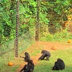 Daneben findet sich ein weitläufiges Areal für die Heranwachsenden und Halbstarken, in dem sich bereits viele Bäume und Büsche befinden, von denen sich die Tiere selbst versorgen können. Die an allen Gehegen aufgezogenen Netze sind bei der Hooligan-Gruppe besonders angebracht. Die Schimpansen sind in dem Alter bereits recht stark und besonders aggressiv. Kaum waren wir in Sichtweite flogen auch schon die Steine. Die zum Teil faustgroßen Brocken erreichen eine ordentliche Geschwindigkeit, wenn man sie mit sprichwörtlichen Affenarmen und passabler Diskuswurftechnik durch die Luft schleudert. Da hieß es, aufpassen und Kopf einziehen, da die Netze nicht alles abzufangen in der Lage sind.