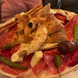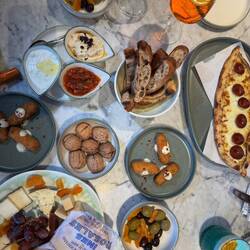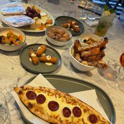 Zwischen den beiden Aufführungen gab es eine recht lange Pause, die wir genutzt haben in dem wir ein sehr frühes Abendessen im Olea Social eingenommen haben. Das Restaurant lag nur ganz wenige Gehminuten vom Theater entfernt. Hier gab es leckeres Brot mit Dips, Käse, Oliven und Pide für uns.