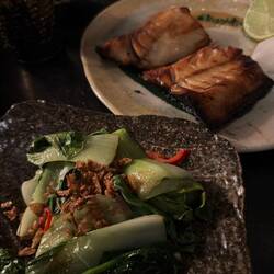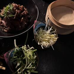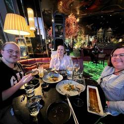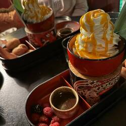 Tatsächlich war einiges vom Essen ziemlich scharf, manches traf nicht den Geschmack von jedem bei uns am Tisch, alles in allem sind wir aber alle satt geworden (wir haben nicht einmal alles geschafft weil die Menge an Speisen am Ende doch extrem war). Laut Menü haben wir Wagyu Rindfleisch gehabt, allerdings hat es für Angi geschmeckt wie normales Rinderfilet und auch von der typischen Marmorierung war nichts erkennbar - ob es also wirklich Wagyu war oder wir gescamt wurden weiß man am Ende des Tages nicht. Robin meinte aber, dass das Fleisch in Zürich beim Teppanyaki besser war und man dort auch wirklich einen geschmacklichen Unterschied zu „normalem“ Fleisch feststellen konnte. Das Dessert war Angi‘s Highlight - es gab Softeis mit Mangosauce, Quarkbällchen mit Zimt-Zucker-Kruste und einer Schokoladensauce (die man sich hätte sparen können, letztendlich wurden die Deko-Himbeeren darin getunkt).Leer más