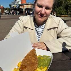 Zum Mittagessen gab es für uns eine Portion Fish & Chips (Zitat Angi: das Essen macht satt, aber nicht glücklich - allerdings nur bezogen auf die Zubereitung hier im Park, die Pommes waren leider ungesalzen und das Erbsenpüree war recht dünnflüssig und ohne Geschmack, der Fisch und die Cola Zero waren leider das einzige wirklich gute am Essen).