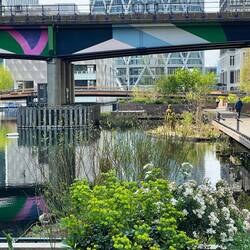 Heute finden sich neben Einkaufsmöglichkeiten und Restaurants auch Bürokomplexe und ein kleiner „Garten“/Ruhebereich am Wasser.