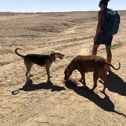 Auf dem Rückweg stehen uns plötzlich 2 Hunde gegenüber. Sie hatten Halsbänder und wedelten freudig mit dem Schwanz. Puh.... zum Glück.... keine Strassenhunde. Die sind zum Teil unberechenbar. Nach einer netten Begrüssung, mit viel Schleck und Hopps folgten uns die Zwei auf Schritt und Tritt. Mehrmaliges verscheuchen, Steine werfen nutzten nichts. Sie begleiteten uns den kompletten Rückweg (1,5 std) bis zum Korafistrand . 🙈 dort hatten sie dann riesigen Spass mit allen am Strand.... aber keine Ahnung ob sie wieder zurückfinden. Wir hoffen es!
