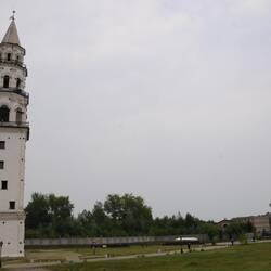 Auf dem Rückweg machen wir noch einen Abstecher nach Nowouralsk, dass bis heute noch eine geschlossene Stadt ist. Dann fahren wir weiter nach Newjansk. Hauptsehenswürdigkeit dort ist der Schiefe Turm, ein 1725-40 im Auftrag der Unternehmerfamilie Demidow errichteter Wachturm. Die Achse des 57,5 Meter hohen Turms weicht an der Spitze um 2,20 Meter von der Vertikalen ab und ist bewusst so gebaut worden. Die Abbildung des schiefen Turms ist auch auf dem Stadtwappen von Newjansk zu sehen.