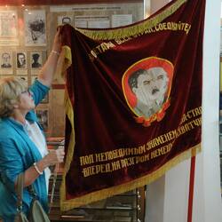 Marina ist die Leiterin des örtlichen Heimatkunde-Museums, in dem die Geschichte der Russlanddeutschen zusammengetragen ist. Er kennt die attraktive Blondine bereits aus dem Vorjahr. Sie stellt uns auch ihren achtjährigen Enkel vor, obwohl sie selbst glatt als Endvierzigerin geschätzt wird. Das Museum ist eine Heimatstube mit viel Bezug zum Dorf Asowo, so dass wir nach viel über die Geschichte der Deutschen in der Region und in Russland erklären müssen. 13.000 Einwohner hat Asowo heute, aber nur eine ganz geringe Anzahl von ihnen sind Deutsche. Als es die Möglichkeit gab sind etwa 8.000 von ihnen nach Deutschland ausgewandert. Man hatte die Nase voll, über 40 Jahren als einzige Nationalität eingesperrt zu sein, Repressionen zu erleiden und die Muttersprache, die deutschen Sprache bei Strafe nicht sprechen zu dürfen. Inzwischen sind die Bauernstellen im Dorf überwiegend von Kasachen und Russen eingenommen worden. Überall sind die Spuren dieses Exodus zu erkennen: Häuser wurden nicht fertig gebaut, Straßen enden im Nirgendwo, Plätze mit Geschäften zeigen viel Leerstand. In der kurzen Blütezeit in den 80/90-iger Jahren sammelte man sich in dieser Region, in der alten Heimat, in der bis 1942 sehr viele Deutsche als freie Bauern gelebt hatten, und gründete einen deutschen Nationalkreis.