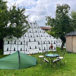 This is as close as I am likely to come to glamping. One of their glamping tents is not being used tonight so I am allowed to pitch my wee tent on that pitch. But not allowed to use the shack that presumably has their toilet etc. I wonder if it’s electric?Meer informatie