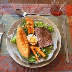 Once I had got over the excitement of being able to get out of bed this morning I was looking forward to breakfast. There being a large chicken run I felt sure there would be a couple of fresh boiled eggs for breakfast. Planned a cute photo of two opened soft eggs, yolk running down nicely, especially for the Buc, him being such a fan of such things. No such luck. The French breakfast really is quite limited. Bread and jam or honey if you are lucky.
