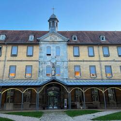 Checked into the hostel. Massive affair. Been a pilgrims’hostel for 1,000 years but I don’t know how much of the building dates from then. There is a much newer building attached by a bridge where you can book private rooms (over £110 a night) but here we are in 4 bedded rooms. At least they are 4 beds , not like the mattresses on the ground of last night, and not bunk beds which I hate. I think the hostel is used by a lot of walking groups as there are loads of folk wandering about with all sorts of walking gear.