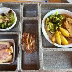 While “enjoying” the usual rubbish breakfast it occurred to me that the pilgrim diet has virtually no fruit and vegetables at all and it is quite difficult to improve it. Nothing is available at breakfast unless you count orange juice. Lunch doesn’t usually happen at all except for a Snickers bar and dinner seldom has any veg options at all.