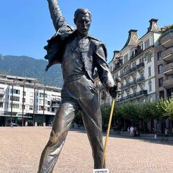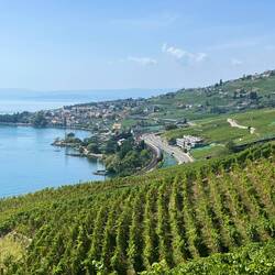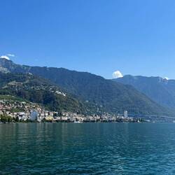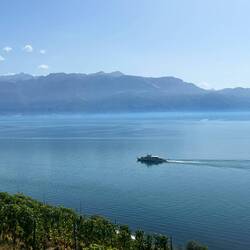 Sweaty hoof up the slopes beside the vines and a very pleasant, if hot, walk along the terraces. Dropped down to the lake-side at Vevey where we have tonight’s hotel. Left the bags at the hotel, (getting a complementary glass of wine as we did so), bought 6 litres of water to make up for what we sweated in the morning, a couple of bananas for lunch and wandered along the lakeside, feeling like we were off on a holiday stroll. After a couple of hours very pleasant walking, checking out the big fork, Charlie Chaplin’s statue and Freddie Mercury’s statue on the way, we reached the station at Territet. Train back to Vevey.