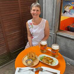 After 6 weeks virtually tee-total it didn’t take long to fall under Glynice’s influence and have a couple of pints of lager for tea together with some sort of Swiss tapas. So much better than last night. Might get used to it I suppose.Meer informatie