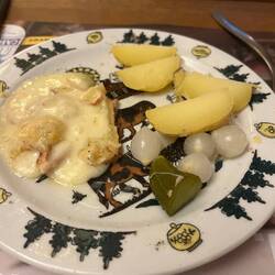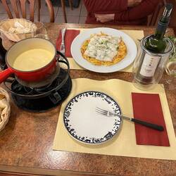 Booked an early meal at a place recommended by our hotel for raclette which I had taken a notion for after the fondue of the previous evening. Better to spend 28€ on a Swiss speciality in Switzerland than 23€ on their take of an Italian pasta dish. Very nice it was too.