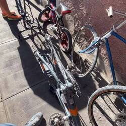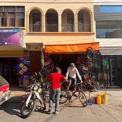 Néanmoins, sur la route de retour, me laissant porter par les descentes raides de Potosí je tombe sur un petit atelier de moto à 300m de l’hôtel, parfait ! Je sens hyper bien l’ambiance et les mécanos sont hyper sympas. Je vais chercher Pl et hop voila au magasin avec nos deux montures. Après perçages des 4 jantes on procède au nettoyage en règles des vélos, et on enlèvera une sacrée quantité de sel 😅