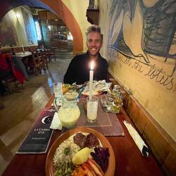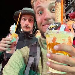 Puis on entame la côte dans l’agglomération de Cusco, c’est vraiment immense, on fera plus de 15km de ville avant d’arriver ! Heureusement il y’a une piste cyclable au milieu de toute cette circulation. La pollution m’irrite la gorge et me donne soif 🥵 A 11h, on arrive enfin dans le centre historique où l’on va trouver notre petit hostel et on est bien content de se poser. PL appel ses parents et moi je file me doucher et me changer pour aller boire une bière avec Lilian, un pote de prépa qui est aussi sur Cusco 😋 PL nous rejoindra au bar et nous irons manger tous les 3 dans un petit resto sympa un almuerzo à 12S. Lilian doit partir s’occuper des enfants de l’asso dans laquelle il travaille et PL et moi déciderons d’aller manger un enormeeee dessert chez un glacier 🤤🤤 Banana split pour PL et fondant au chocolat pour moi, tout ça pour 8€. Miam miam, c’est un régal !