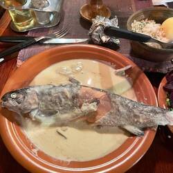 Ensuite, avant de partir on se restaure. Au menu, presque évident ici, truite au bord de la plage. Délicieux.