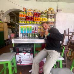 Aujourd’hui 118km au programme mais avec 90km de plat au départ. On roule donc très bien jusqu’à 9h ou on fait une pause gâteau, on a déjà fait 50km. On s’arrête pour manger au 80eme km car après il n’y a plus rien. Almuerzo donc dans la petite ville de Santa Rosa ! A 10h30😅😅 Un très bon menu avec Soupe de pomme de terre, carottes, viande puis un plat de riz, pâtes et viande ! Le tout couronné d’un petit jus de API. Parfait, tout ça pour la somme de 7 soles chacun.
