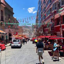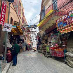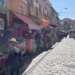Pl a mis son réveil tôt car il a une grosse journée de vélo aujourd’hui ! 110km et 1800 de D+ ! Je déjeune avec lui et l’aide à descendre ses affaires. Devant l’hôtel il y’a un énorme marché, on est bloqué on ne peut plus sortir de chez nous 😅. Les boliviens font des commentaires sur le vélo de Pl et aménage l’espace pour le laisser sortir.