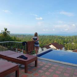 Dafür hat man aber einen traumhaften Blick aufs Meer und die benachbarten Inseln. Hinter uns ist nur noch der Dschungel, mit wilden Monkeys, jeder Menge Moskitos und Schlangen. Heute Morgen, nach einem herrlichen Sonnenaufgang, wurde ich dann später, auf der Veranda von einem schwarzen Hund begrüßt. Sehr lieb, mit Halsband und einer Menge Flöhe. Er verlies uns erst am späten Nachmittag, als sein Herrchen von der Arbeit kam. Mal sehen, ob er morgen wiederkommt...Read more