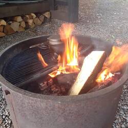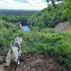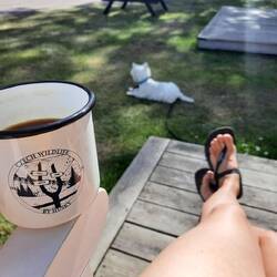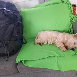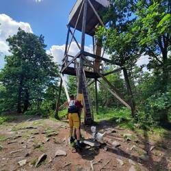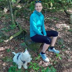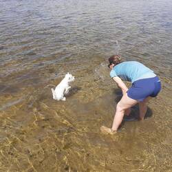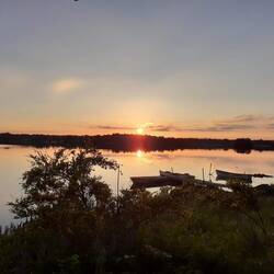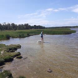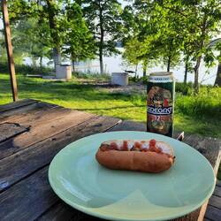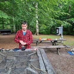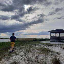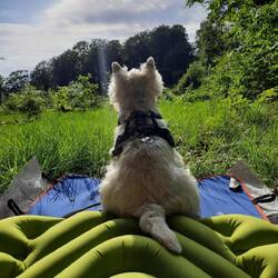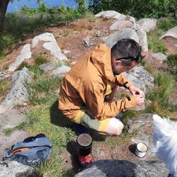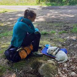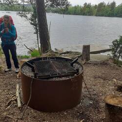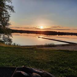 Druhý den snídaně a pokračování v cestě cca 13km. S přístřeškem který má vyhled na jezero. Viděli jsme Orlovce říčního. Hermína snědla něco jako granule a byla opetace