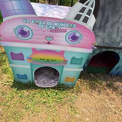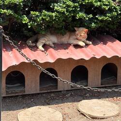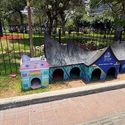 There were cats who live in the park but people are mot allowed to abandon unwanted cats in the park. There are little cat houses that are designed from different parts of the world and different architectural influences to house them and little food dishes for them. Cute!
