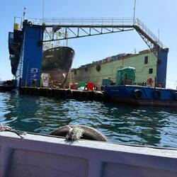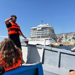 Pablo took us also on a boat ride through the port, where we saw container barges/cranes, naval vessels, and in particular a very special replica of one to the Chilean people here, where they fought the Bolivians in battle at sea. The replica shop is in use today, by their military for training purposes.