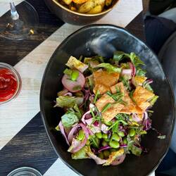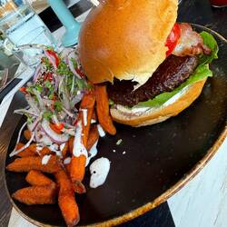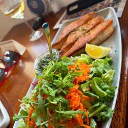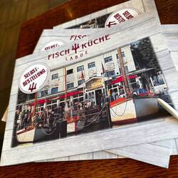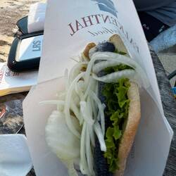 Es war sehr warm! Jacke? 😅Brauchen wir nicht… 7,2 km …angekommen haben wir etwas gesucht, wo es ein bisschen was zwischen die Kiemen gab… und wir sind fündig geworden! „FISCHKÜCHE LABOE“ falls mal jemand von euch da ist… 👍 sehr nettes Personal und leckeres Essen 🐟🎣🍤🐠
