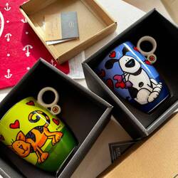 In einem kleinen aber leider nicht so freundlichem Teeladen hier im Ort, hatte Alex schon von zu Hause gesehen, gab es „EdHeck-Tassen“ (ein Künstler, der viele Bilder auf und mit AIDA-Schiffen verkauft) da haben wir uns als Erinnerung dann noch Hund und Katze mitgenommen…