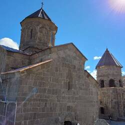 ...unser heutiges Ziel: die Dreifaltigkeitskirche in Stepanzminda. Sie liegt auf 1.700m Höhe, nachdem man zuerst den Kreuzpass (2.390m) überquert. In rund 10km befindet sich die einzige Grenze zuLæs mere