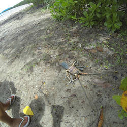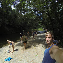 Wir fanden uns alle zur vereinbarten Zeit im Bus ein, wobei wir auf ein paar wenige warten mussten, da sie glaube ein Spinne füttern wollten. Unserer nächste Busfahrt führte uns immer tiefer in den Regenwald, wobei die asphaltierte Straße einen Schotterweg gewichen ist. Wir kamen schlieslich an einem Punkt an, den wir nicht passieren hätten können, da nur Geländegängige Fahrzeuge den vor uns liegenden Bach durchqueren hätten können. Wir wollten auch nicht weiter und stellten den Bus an diesem Ort ab. Auf Rat von Joey ging es Barfuß durch den dichten Wald, lediglich ein kleiner Pfad zeigte uns den Weg. Es war ziemlich schlammig, weswegen die Entscheidung ohne Flip Flops zu laufen goldrichtig war. Nach einen längeren Fussmarsch kamen wir an einem größeren Bach heraus, wo wir uns im Wasser austoben konnten. Hierfür konnte man auf der gegenüberliegenden Seite die Wurzel eines Baumes etwa 5 bis 6m nach oben klettern und folglich nach unten springen. Weiter gab es ein Seil welches an einem Ast befestigt war und zum reinspringen genutzt werden konnte. Allerdings konnte man kaum Schwung holen, wodurch es mehr Spaß machte von oben ins Wasser zu springen. Das Seil hatte mehrere Knoten, welche zum festhalten gedacht waren. Einer versuchte dann herauf zu klettern und schaffte es nicht bis ganz nach oben. Ok, dann probiere ich es mal :) Gesagt getan und ich kam auch oben an. Später versuchte es noch ein weiterer, welcher ebenfalls kurz vorher aufgeben musste. Also dreimal auf meine Schulter geklopft :P Ich war übrigens noch einmal laufen und hab zwischendurch paar Kraftstationen eingebaut gehabt und ich jetzt schön Muskelkater habe und das von nur einmal eine Einheit welche nicht besonders lang war :D