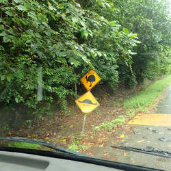 Wir fuhren glaube wieder eine Stunde, ehe wir an einer Fähre ankamen, wo wir mit dem Bus übersetzten . Auf der anderen Seite hieß es nun die Augen offen zu halten, denn hier konnte man Coasowarys in der Wildnis sehen. Dies sind flugunfähige Laufvögel mit einem größeren Hon auf dem Kopf und sind glaube ich wie die Korkodile noch ein überbleibsel vergangener Zeiten. So einen Laufvogel habe ich ja bereits im Australischen Zoo gesehen. Also wer daran interessiert ist, einfach das Video anschauen, denn wir haben an diesem Tag keinen gesehen. Lediglich die Warnschilder gaben einen Hinweis auf solche. Ein Schild war auch ganz lustig, welches einen Cassowary zeigte, wie er steht mit dem Hinweis bevor und wie er lag, ebenfalls mit einem Hinweis after. Unser nächstes Ziel war bereits das Mittagessen, welches wir bei Reiseantritt auswählen konnten. Bei mir gab es Hänchenwrap mit Pommes, was ziemlich lecker war. Nach dem Essen hatten wir die Möglichkeit an den Strand zu gehen, hierfür führte ein Weg durch den Regenwald, welcher später durch einen Holzsteg ersetzt wurde, da es durch sumpfiges Gelände ging und folglich am Strand endete. Das besondere an diesem Ort, der Regenwald reicht hier bis an das Meer heran, was natürlich eine tolle Kulisse war. Wir gingen ein wenig am Strand entlang und vertrieben uns die Zeit.
