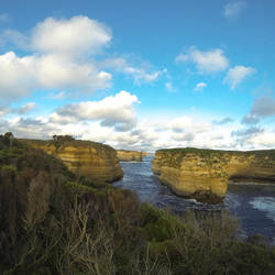 Wir waren ziemlich weit von der Küste entfernt, das hieß, die vor uns liegenden Kilometer führten uns durch verlassene Gegenden und teilweise dichten Regenwald. Die erste Aussicht auf das Meer bekamen wir wieder in Moonlight Head. Um zu diesem Strand bzw. Aussichtspunkt zu gelangen, steuerte ich unseren Stadtflitzer wieder über unbefestigte Straßen. Die Farbe der Erde war zunehmend roter. Wir verliesen den Wald und kamen an die Küste, wo die Vegetation um einiges flacher war. Das Auto war abgestellt und wir unterwegs zum Gable Lookout. Für euch wird es wohl immer gleich klingen, Küste, Meer, Aussicht aber jeder Aussichtspunkt war anders und immer wieder beeindruckend. Wir trafen vor diesen eine Frau, welche ihre Sachen abgelegt hatte und sich gerade etwas zu Essen machte. Die Aussichtsplattform befand sich etwa 90 Meter über dem Meer und wir konnten auf den Wreckbeach und die Steilküste schauen. Der Strand war unser nächstes Ziel, hierfür gingen wir die Spitzhaustreppen Australiens ca. 350 Stufen zum Strand herunter. Dort sollten die Anker von zwei gestrandeten Schiffen einbetoniert sein. Auf dem Weg sahen wir ein Schild, was das Mitnehmen von Muscheln verbot. Deswegen waren überall am Strand wunderschöne Muscheln zu finden, die Anker blieben jedoch verschwunden. Wir liefen ein wenig am Strand entlang und erkundeten diesen ein wenig. Das Wasser stand ziemlich hoch und ich vermutete, dass die Anker womöglich nur bei Ebbe zu sehen sein sollten. Nach späteren Recherchen war es auch so. Die Treppen waren wieder erklommen, wir wieder zurück im Auto und wenig später wieder auf der befestigten Straße in Richtung des Highlights der Great Ocean Road unterwegs. Wir fuhren nach Princetown ein wenig von der Küste entfernt und landeten bei Gibson Steps Lookout. Ich verpasste die Einfahrt und stellte es somit einfach am Rande der Straße ab. Wir sahen den ersten allein sehenden Felsen im Meer, welches sehr beeindruckend war. Zudem führte eine Treppe herunter zum Strand und bei Ebbe, welche leider nicht war, kann man zu diesem Felsen hinlaufen. Wir beide hatten diesen Ort noch nicht wirklich realisiert und kamen fünf Minuten später an den Zwölf Aposteln an, der touristischen Attraktion und eines der Wahrzeichen Australiens. Helikopter kreisten am Himmel und wir parkten unser Auto ab. Der erste Weg führte ins Center der Zwölf Apostel, denn wir brauchten bei den Temperaturen und dem Wind einen warmen Kaffee. Viele Reisebusse standen auf dem Parkplatz, dementsprechend voll und fast überlaufen war dieser Ort. Wir liesen uns aber deswegen den Moment nicht vermiesen und genossen den Blick auf die Gesteinsformationen, der übrig gebliebenen acht Felsen. Eigentlich waren es mal neun statt der zwölf, wie es der Name sagt. Eine der Felsen ist im Jahre 2005 in sich zusammen gebrochen. Wir erkämpften uns die guten Plätze am Geländer, welche die besten Bilder versprachen (Ganz so schlimm war es nicht aber es war voll). Wir hatten mehrere Blickwinkel, Wege und Bilder hinter uns und waren begeistert von diesem Ort. Der Wind und die vor uns liegenden Aussichtspunkte trieben uns zum Auto. Danach folgte eine Jagt nach den Aussichtspunkten und vielen beeindruckenden Ausblicken auf die berühmte Steilküste. Da wir jeden mitnahmen, mussten wir viele vor uns liegende auslassen, da die Dunkelheit hereinbrach. Wir schafften es nur bis zum Lookout von Loch Ard George und der Thundercave. Das Meer hatte die Küste auf ihre Weise interessant gestaltet und geformt, sodass wir uns nicht satt sehen konnten. Ein paar Aussichtspunkte waren am Rande der Steilküste, ein Anderer führte uns an einen Strand herunter. Dieser war durch die hohen Felsen fast eingeschlossen und manche Bereiche waren ziemlich unterspült und waren der Beginn von kleinen Höhlen. Ein großer Felsen war wie eine kleine Brücke mit einem Loch in der Mitte. Zum Schluss kamen wir an einen flacheren Teil, die Sonne stand zu diesem Zeitpunkt bereits ziemlich tief. Wir konnten bis auf einen Felsen vorlaufen, auf welchen die Wellen brandeten und die Gicht durch die letzten Sonnenstrahlen wehte. Wir schossen die letzten Bilder an diesem Tag und freuten uns nun auf einen wärmeren Platz.