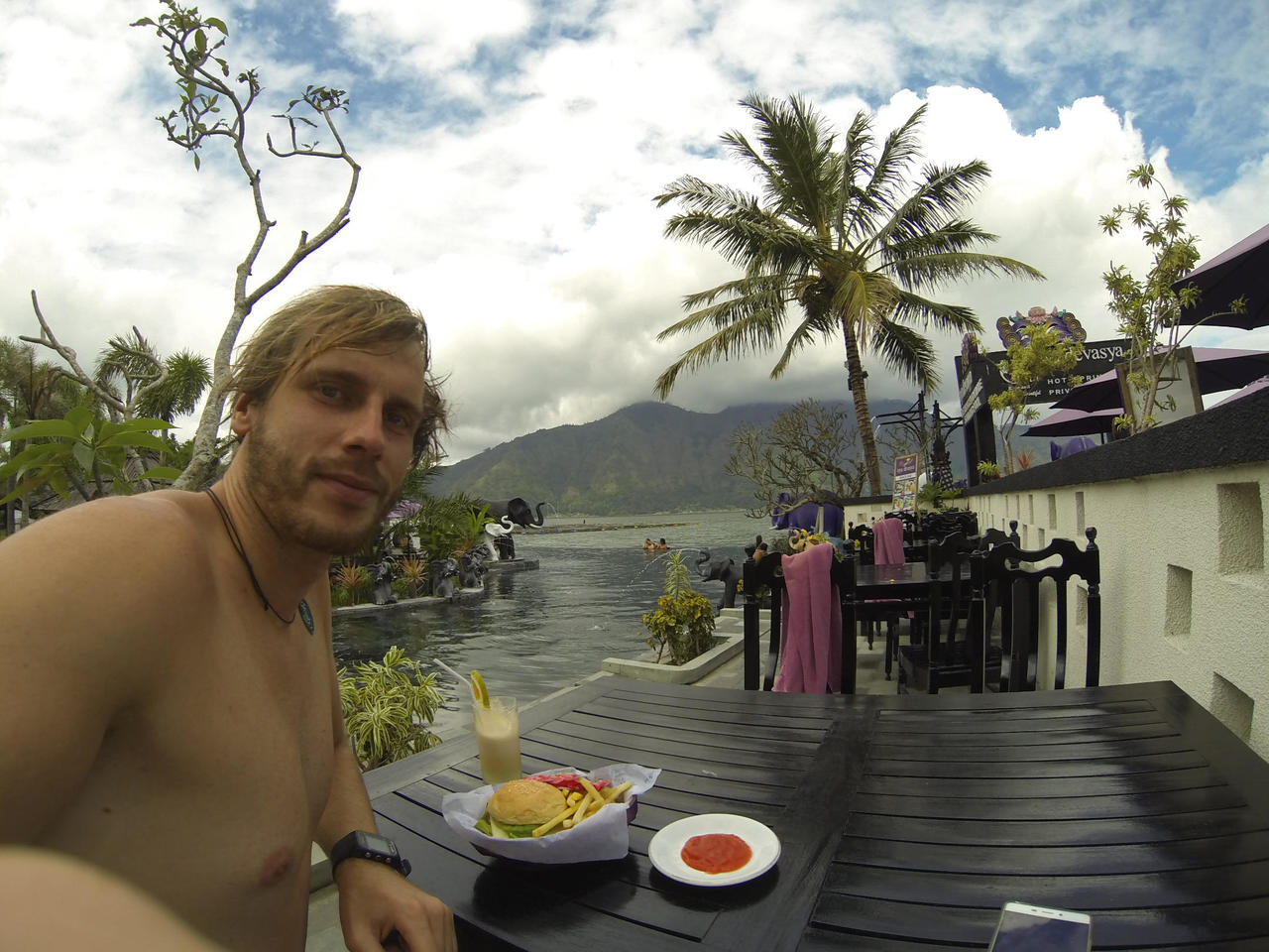 Da es heute nicht so gelaufen war wie ich es mir vorgestellt hatte, scham ich ein paar Bahnen, ehe ich mich in die warmen Becken begab und entspannte. Danach ruhte ich ein wenig auf der Liege und probierte mich durch alle warmen Becken durch. Eines davon liegt direkt am See, mit Blick auf Diesen und dem Mount Agung. Dieser ist wesentlich höher und soll ebenfalls bestiegen werden, er ist zugleich auch meine Hoffnung, doch den Sonnenaufgang von oben beobachten zu können. Nachdem ich heruntergekommen war, kaufte ich mir einen Burger und einen Shake und genoss den Augenblick. Ich verbrachte ein paar Stunden in diesem Bad und probierte das heißeste Becken zum Schluss. Es war wirklich herrlich. Zudem sind am Rand lauter Elefantenstatuen aufgestellt, aus deren Rüsseln noch wärmeres Wasser heraus kommt. Da ich noch ein weiteres Ziel in dieser Gegend hatte, packte ich mein Zeug, lud mir mit dem Wlancode noch die Sprache Indonesisch herunter und ging zur Kasse. Auf diesen traf ich zwei Amerikaner, welchen ich meinen Wlancode anbot und somit ins Gespräch kamen. Die beiden waren heute auch auf dem Berg gewesen und einem war es wie mir ergangen und hatte so ein ranzigen Helm am Lenker. Auf zur Kasse, das Bezahlsystem im Bad funktioniert mit Karte und es wird standardmäßig 100.000 Rupiah beim Kauf des Tickets drauf gebucht. Mein Essen und mein Getränk kamen 70.000 Rupiah und ich sollte bloß 20.000 Rupiah zurück bekommen. Als ich den Kassenzettel vom Lokal anschaute, hatten die mir eine Servicegebühr von 7.000 Rupiah abgezogen. Ich verlangte daraufhin die 23.000 Rupiah zurück und fühlte mich ein weiteres Mal ein wenig verarscht. Es ist nicht viel Geld für uns aber einfach, wie der Tag heute verlaufen ist war nervig.