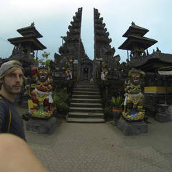 Nach einem langen Tag, sollte es nach Hause gehen, bis ich durch Zufall an einem großen bunten Tempel vorbei kam. Schnell angehalten und nachgeschaut, es war der zweitwichtigste Tempel Balis. Daraufhin nahm ich die Gelegenheit war und bekam zu meinen Ticket ein Fruchtshake, welchen ich dankend annahm und danach den Tempel erkundete. Er war ziemlich verlassen und der große Tourischwung bereits vorbei. Ich war der einzigste Touri, was mich nicht störte, so konnte ich schöne Aufnahmen machen. Einzig die dunkle Wand hinter dem Tempel machte mir ein wenig sorgen in Bezug auf die Heimfahrt. Es war der bis dahin größte Tempel und auch der schönste. Viele bunte Statuen und Schreine. Viele Höfe und Plätze. Übrigens gab es auch hier wieder viele Hunde, welche die Opfergaben plünderten. Da ich heute einen etwas längeren Tag hinter mir hatte, ging ich etwas schneller hindurch und wurde von einer Frau auf dem Weg zum Roller abgefangen. Sie zeigte mir noch einen privaten kleinen Tempel hinter dem Großen. Natürlich war dies nicht ohne Eigennutz. Sie malt Bilder mit Vulkansand. Dazu nimmt sie Vulkangestein zermahlt dieses, bringt Kleber auf das Papier und streut diesen Sand darauf. Sie macht dies mit unterschiedlichen Farben und die waren echt schick aber ich denke, dass ich mir es nirgendwo hinstellen würde. Ich fragte sie ein wenig über ihre Kultur und danach sollte es nach Hause gehen.