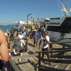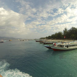 Schließlich legte die Fähre an und ich war mal wieder einen Schritt weiter. Wir mussten zuerst unter Deck und als die Fähre abgelegt hatte konnte wir nach oben. Unten kam ein Video mit Untertiteln aber ich zog die schöne Aussicht auf Balis Küstenlinie vor. Ich setzte mich neben zwei, welche bereits im Wartebereich mir gegenüber gesessen hatten. Er kommt aus Schottland, war ehemals Backpacker aber lebt seit sieben Jahren in Sydney. Er war nicht alleine unterwegs und reiste mit einer Freundin, welche aus Australien kommt. Wir unterhielten uns die gesamte Fahrt über und ich war etwas erstaunt wie viel Bier er in der prallen Sonne trinken konnte. Da ging Eins nach den Anderen aber nicht umsonst ist er auf dem Weg zu der Party Insel Gili Trawangan. Diese Insel fuhren wir zuerst an und ich hatte den Weg ein wenig unterschätzt, welchen wir bis dahin zurück legen mussten. Der erste Schwung war vom Boot und nun nach Gili Air, wo ich eine Zwischenstation hatte. Bereits vom Wasser aus konnte man die hellen Sandstrände sehen und teilweise viele einheimische Boote im Hafenbereich. Heute früh noch im Regen losgefahren und jetzt in der prallen Sonne auf ein paar wunderschönen Inseln. Bevor ich die genießen konnte, hieß es ein Boot nach Gili Meno zu suchen. Dort werde ich die nächsten Tage verbringen und es soll die ruhigste und vom Tourismus unerschlossenste Insel sein. Wenn ich allerdings das große Angebot bei Booking.com gesehen hatte, lässt mich dies zweifeln. Ich fragte am Ticketbüro nach einem Ticket, darauf wurde ein Mann heran gerufen und verlangte einen Preis von 150.000 Rupiah. Nur zur Information, es sollte nur zur unmittelbaren Nachbarinsel gehen. Ich konnte den Preis nur auf 100.000 Rupiah drücken. Er hatte leider das Argument der letzte Fähre auf seiner Seite, also musste ich das Boot nehmen.