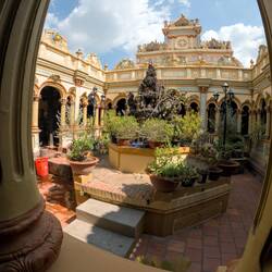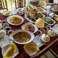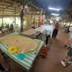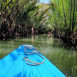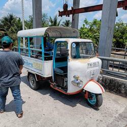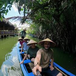 Wir stiegen in ein kleines dreirädriges motorisiertes Gefährt um. Kleine Fahrerkabine mit einer zur Sitzfläche ausgebaute überdachte Fahrerkabine, gerade Platz für sechs Personen und wurde spaßiger Weise Lamborgini genannt, da mit LambroXXX bezeichnet war. Nach kurzer Zeit verließen wir das von Palmen dicht bewachsene Gebiet und kamen in eine Kleinstadt, welche wir schnell durchquert hatten. Gleich drei Programmpunkte warteten bei der Ankunft auf uns. Wir befanden uns auf einem sehr großen Erlebnisgastronomiegelände. Viele größere überdachte Bereiche mit gedeckten Tischen, kleine Becken, mit Fischen, Krabben oder auch einer Schildkröte. Aber dies ließen wir vorerst links liegen und fanden uns wenig später in den traditionellen Holzboten auf einem schmalen Seitenarm wieder. Der kleine Kanal, war etwa drei bis vier Meter breit und die Palmen ragten wie Mangroven am Uferbereich ins Wasser. Über uns ragten die Blätter der Palmen dicht ineinander und wir glitten ruhig durch die schöne Natur. Leider war diese Fahrt bereits nach zehn Minuten wieder vorbei. Für den zweiten Programmpunkt schnappte sich jeder ein Fahrrad und damit ging es einmal um den „Block“. Die Fahrräder waren im durchschnittlichen Zustand aber eher schon etwas gebraucht. Caro hatte Pech und hatte einen Ausreißer nach unten erwischt. Eine starke Acht im Hinterreifen, welches bei höheren Geschwindigkeiten das gesamte Fahrrad in Schwingung versetzte. Ich wechselte kurz mit Caro das Fahrrad. Die Tour dauerte ebenfalls nur circa zehn Minuten und warum diese hier angeboten wurde, erschloss mir nicht so recht. Vielleicht sich ein wenig zu bewegen und Hunger zu bekommen, denn das Mittagessen war hier der dritte Programmpunkt. Der Tisch war reich gedeckt, Frühlingsrollen, Wasserspinat, Reis, Suppe, Hühnchen und in der Mitte war ein großer Fisch drapiert, welcher danach in kleine Portionen zerteilt und in Sommerrollen mit Salat serviert wurde. Sehr schön anzusehen und lecker war es ebenfalls.