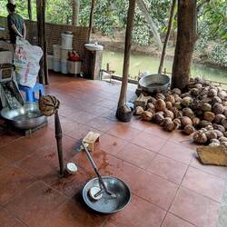 Wir kamen an der Marina an und bekamen fix unser Boot zugewiesen. Es gibt in diesem Bereich vier Inseln, welche alle eine bestimmte Bedeutung haben. Es gibt die Phönix Insel (Schönheit, Erfolg), die Drachen Insel (Weisheit, Macht), die Qilin Insel (Glück, Frieden) und die Schildkröten Insel (Stärke, ewige Existenz). Diese vier Fabelwesen, sind ein fester Bestandteil der vietnamesischen Kultur und in jeder Pagode zu finden. Unsere erste Fahrt führte uns quer über den Mekong auf die andere Seite des Flusses. Das Holzboot war etwa 20 Meter lang, überdacht und zu den Seiten hin offen. Das Steuerrad wir mit dem Ruder über zwei Seile verbunden, welche links und rechts entlang der Sitzflächen nach hinten verliefen. Das besondere, jedes Boot, was auf dem Mekong umherfährt, besitzt am vorderen Bug Augen. Diese sollen sicherstellen, dass niemand auf dem Fluss verloren geht. Auf der anderen Seite angekommen gingen es einen schmalen Weg entlang, welcher von etlichen Palmen geschmückt war. Der Bereich wird auch das Kokosnusskönigreich bezeichnet, so war es nicht verwunderlich, dass unsere erste Station sich um die Herstellung von Kokosnusssüßigkeiten handelte. Patrick erklärte uns die verschiedenen Herstellungsschritte und musste sich beim Schälen der Kokosnuss etwas abmühen, was für Geübte innerhalb von circa 20 Sekunden erledigt ist. Wir folgten aufmerksam seinen Erläuterungen, während im Hintergrund die Produktion im vollen Gange war. Zum Schluss konnte man sämtliche Süßigkeiten in verschiedenen Geschmacksrichtungen erwerben. Am selben Stand wurden uns noch verschiedene Schnapssorten zum Probieren angeboten. Vielleicht um den Magen zu desinfizieren, wer weiß. Es gab Kokosnuss- und Bananenschnaps aber auch das bekannte Happy Water. Das ist Reiswein mit eingelegter Schlange, welchen verschiedene heilende Dinge nachgesagt wird.