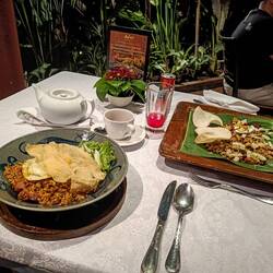 Von außen sah es schon schick aus aber von innen machte es noch einen deutlich besseren Eindruck. Eigentlich dachten wir in ein Low Budget Restaurant zu gehen und fanden uns in ein fünf Sterne Hotel wieder. Wir, ungeduscht vom Tag, mit eher sportlichen Klamotten, bekamen trotzdem einen Tisch zugewiesen. Wir saßen in einem kleinen Innenhof, der Pool in der Mitte war durch Bambussträucher abgetrennt und mit Beleuchtung in Szene gesetzt. Die Speisen, welche zum Nachbartisch gingen, kamen auf großen Holztellern und waren gekonnt dekoriert. Wir bestellten und sollten von unserem Essen nicht enttäuscht werden. Wir bestellten beide eine Art Nasi Goreng (gebratener Reis mit Gemüse und Fleisch). Danach hatten wir allerdings genug vom Laufen, zudem gibt es hier so gut wie keine Fußwege. Für einen Euro riefen wir einen Grab, welcher uns zur Unterkunft brachte. Eine Aufgabe stand noch an und das war die Buchung bis Gili Air. Bus und Fähre waren damit erledigt. Leider werden wir auch in Banyuwangi am Abend nach der ersten Nacht aufbrechen müssen. Dafür stehen auf Gili Air entspanntere Tage an.