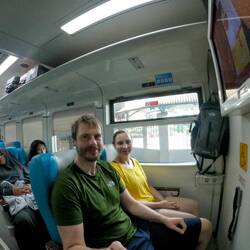 Statt über Nacht, geht es heute über den Tag nach Malang und das mit dem Zug. Das Frühstück ließen wir weg, dafür hatten wir einen Fressbeutel für den Zug vorbereitet. Mit den Backpacks auf dem Rücken waren die 15 Minuten zum Bahnhof schnell überwunden. Nach einem Hinweis fanden wir den richtigen Eingang und stiegen in den Zug ein und wieder aus. Wir mussten auf Gleis drei und der Weg führte zwangsweise über die Gleise und auf dem dritten Gleis stand bereits ein Zug aber nicht unserer. Dahinter war der Wartebereich, also zeigte uns der Schaffner den Weg durch den Zug 😊. Der nächste würde allerdings unser sein.