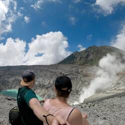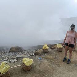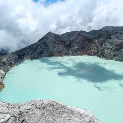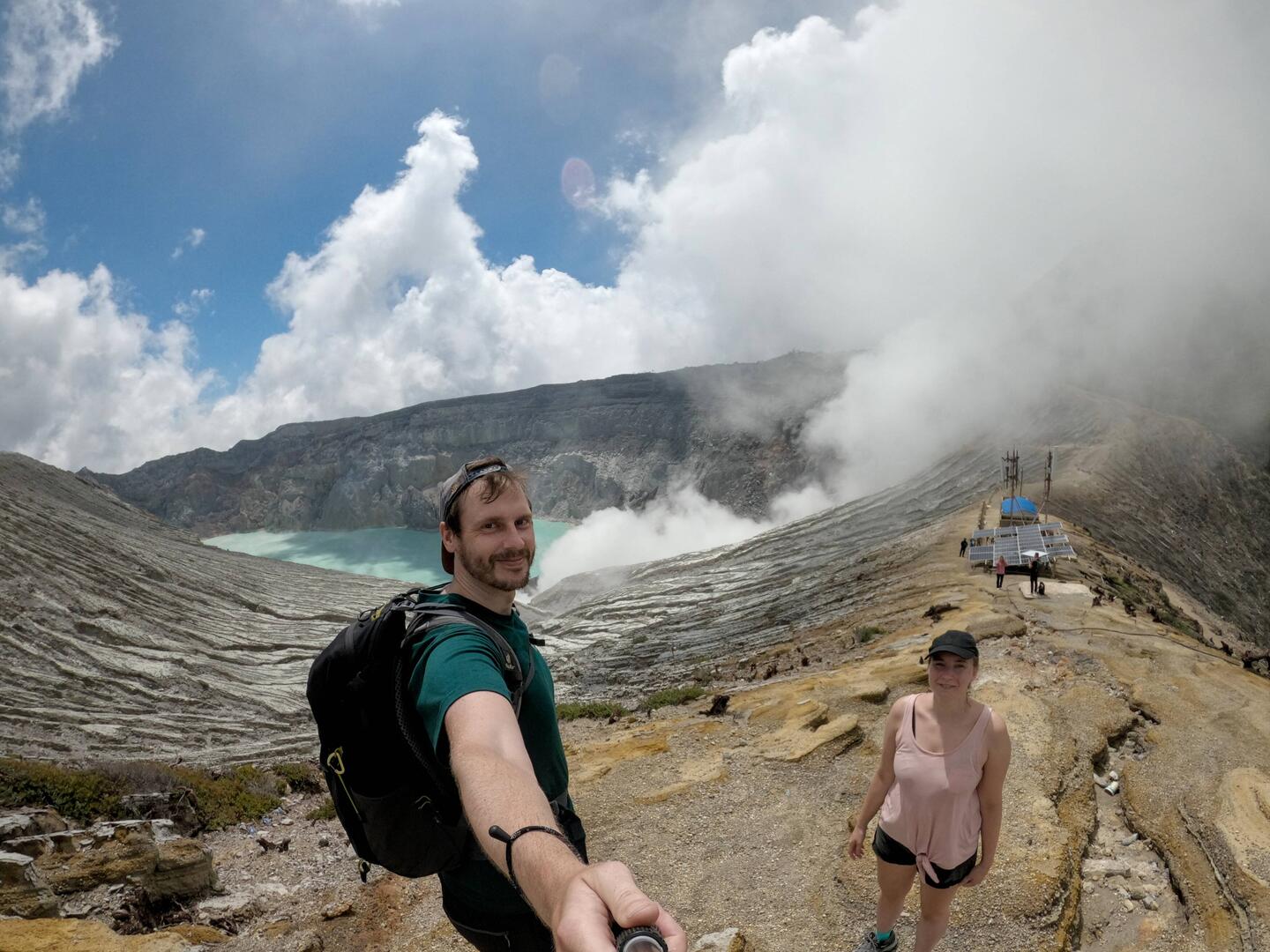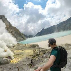 Das erste was wir sahen, war ein großer Parkplatz von Handwagen. So umgebaut, dass was Schweres transportiert werden konnte. Noch ein wenig fragend, was es damit auf sich hatte, setzten wir unseren Weg fort. Der Weg war ein gut präparierter Erdweg, welcher steiler und steiler wurde. Touristen waren kaum anzutreffen und wenn, waren sie gerade auf dem Weg zurück. Dann sahen wir den ersten Handwagen im Einsatz. Ein Herr mittleren Alters wurde damit den Berg hinab chauffiert. Also waren die Wägen für verletzte oder erschöpfte Touristen. Insgesamt gab es auf dem Weg nach oben drei Versorgungspunkte, welche nur noch teilweise im Betrieb waren. Wir hatten aber vorgesorgt, weswegen es kein Problem darstellte. Unter uns hatte sich eine Wolkendecke gebildet, welche gelegentlich die ein oder andere Aussicht ins Tal freigab. Die steilsten Stellen ließen wir hinter uns, der restliche Abschnitt schlängelte sich im sachten Anstieg zum Krater nach oben. Wir kamen um eine Biegung und da eröffnete sich der Krater förmlich vor uns. Die Rauchwolke stieg vor uns empor und wehte den wohlduftenden Schwefelgeruch unseren Köpfen entgegen. Abgelenkt von der wunderschönen Aussicht auf den hell türkisfarbenen Kratersee, hielte wir es recht lang aus, bevor wir den Kraterrand weiter nach oben folgten. Die 400 Höhenmeter waren in einer Stunde erledigt, warum man hier ein medizinisches Attest oder einen Guide benötigt, ist mir unklar. Der Weg war jetzt stärker zerklüftet, gerölliger und nicht mehr so offiziell. Aber die Spuren wiesen darauf hin, dass bereits andere den Weg genommen hatten. Ein wenig bergauf und wieder runter, gelangten wir auf einen vorgelagerten Abschnitt mit rundum Blick auf den Kratersee. Ich wollte gerade an die Kante und machte gleich einen Schritt zurück, denn da ging es gleich 150 Meter weiter runter und wir wussten nicht wie lose das Gestein war. Mit Abstand zur Felskante, machten wir ein kleines Picknick und ich fing mit der Drohne ein paar Bilder ein. Der Rauch stieg stetig aus dem Schwefelabbaugebiet empor und die Wolken prallten immer wieder vom Kraterrand ab. Am Kraterrand selbst waren nur vielleicht sechs Leute zu sehen, teilweise waren wir neben ein paar Schwefelarbeitern allein. Frisch gestärkt wollten wir runter zum Kratersee laufen. Beim Einstieg sahen wir bereits schwere Schwefelsäcke stehen oder teilweise in Holztragesystemen gelagert. Mit den Atemmasken aufgesetzt, ging es einen recht unbequemen Weg nach unten. Steil, unstetig, kleine Trittstufen, machten es schwerer aber das war nichts gegen die Schwefelarbeiter. Man hörte es immer wieder husten und gesund sahen sie auch nicht mehr aus. Teilweise ohne Maske hievten sie den Schwefel vom Kratersee nach oben. Ohne Maske mussten wir beide am Kraterrand schon husten und der Dampf ließ meine Augen ein wenig Tränen. Auf dem Rückweg hatte ich ein gefülltes Holzgestell angehoben und das waren sicherlich 30kg bis 40kg. Die Arbeiter kämpften sich im Schneckentempo langsam nach oben und wir uns nach unten. Wir gelangten zu einem Aussichtspunkt, ignorierten ein Schild und gingen weiter nach unten, da wo die Schwefelarbeiter den Schwefel abbauten. Es war nicht mehr weit aber Caro war es zu unsicher, sodass ich die letzten Meter alleine ging. Ich versuchte mich den teils gelben Wolken fernzuhalten, was mir nicht immer gelang. Unten angekommen ergab sich ein surreales Bild. Links neben mir kamen Rohre aus dem Berg, wo dichter Qualm austrat. Die Steine ringsherum waren teilweise gelb vom Schwefel eingefärbt und vor mir der hell türkisfarbene Kratersee, mit leichten Dampfwolken, die nach oben stiegen. Lange Zeit wollte ich hier allein nicht verbringen, denn es war keiner weiter hier unten, nicht mal ein Schwefelarbeiter. Ambitioniert startete ich meinen Rückweg, musste aber schnell feststellen, dass es sich durch die Maske nicht schnell atmen ließ. Ein wenig außer Puste ging es mit Caro den steilen Felsweg wieder zum Kraterrand nach oben. Unvorstellbar, dass die Arbeiter den schweren Schwefel mehrmals täglich hier nach oben tragen. Wir traten bald den Rückweg an. Zwei Schwefelarbeiter hatten sich oben noch ausgeruht und ihre Handwägen beladen. Wir halfen einen den Wagen ein kleines Stück nach oben zu schieben, ehe wir uns über den Wolken nach unten arbeiteten. Inzwischen hatte sich eine starke Wolkendecke unter uns gebildet, welche keine Aussicht ins Tal mehr zuließ. Unten beim Roller angelangt genossen wir noch einen Kaffee.