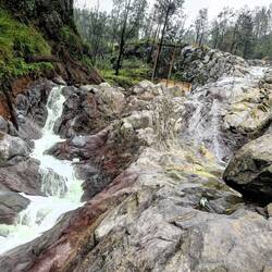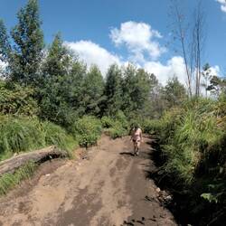 Wieder auf dem Roller waren wir aber nicht auf dem Heimweg, sondern zu einem Wasserfall unweit unseres Standortes. Die Straße war auf dieser Seite viel schlechter, sodass plötzlich tiefe Schlaglöcher über die gesamt Spurbreite nach Kurven erschienen, etwas vorsichtiger ging es somit weiter. Der Wasserfall sah schon schön aus, aber vielmehr war seine Gelbfärbung interessant. Das Wasser kommt direkt vom Kratersee und beinhaltet neben Schwefel, Chloride, Fluoride und Schwefelsäure. Wir wollten unsere Zeit mit dem Roller nicht überziehen, den wir für 24h gemietet hatten und somit machten wir uns nur auf den Weg zurück. Den Anfang waren wir in einer dichten Wolkendecke gefangen, welche uns wie ein Pflanzenbefeuchter die kleinen Wassertropfen ins Gesicht drückte. Der Weg führte steil bergab und ich wechselte zwischen den Bremsen hin und her, wie es mir der Sohn von der Verleihstation empfohlen hatte. An einer steilen Abfahrt schloss sich unmittelbar eine Kurve an, welche mit vielen alten Autoreifen bestückt war. Falls die Bremsen versagen würden, immerhin eine Vorsichtsmaßnahme. Als wir die Wolkendecke durchbrachen, wurde die Strecke wieder sachter und wir kamen schneller voran.
