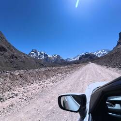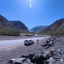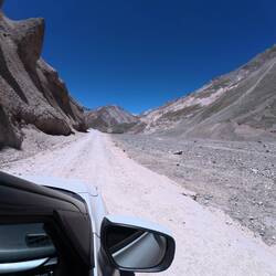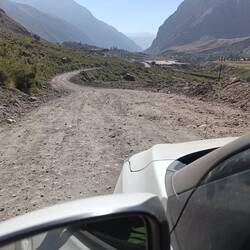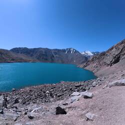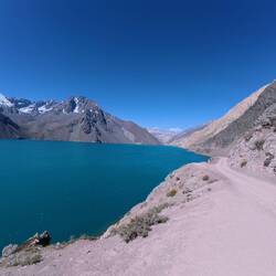 Da wir die Zeit etwas aus den Augen verloren hatten, beschlossen wir gleich zum zweiten Ziel zu fahren und nicht erst in der Unterkunft einzuchecken, an der waren wir bereits vorbeigefahren. Der Weg zum Embalse el Yeso war zwar auch nur über eine Offroadstraße erreichbar aber diesmal deutlich besser. Der Embalse el Yeso ist ein Stausee, welcher zur Sicherung des Trinkwassers für Santiago de Chile dient. Die Wasserkapazität beträgt 250 Millionen Kubikmeter und er ist bekannt für sein türkisblaues Wasser und ein imposantes Bergpanorama und ja, wir sollte nicht enttäuscht werden. Am Stausee war rechts eine Offroadstraße aus dem Felsen geschlagen, welche wir nutzten und fast zu dessen Ende fuhren. Genutzt wurde diese auch von riesigen Lastern, wobei ich mit dem Gewicht da nicht langfahren würde. Sicherheitselemente gab es nicht, gibt die Straße nach, bist du im Wasser. Am anderen Ende hatten sich aber auch vereinzelt Camper am See niedergelassen.