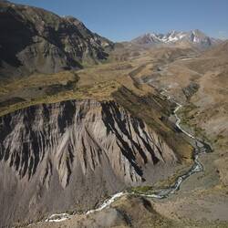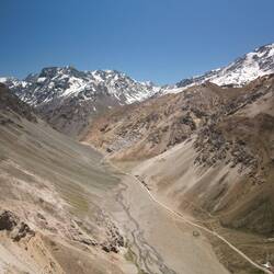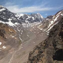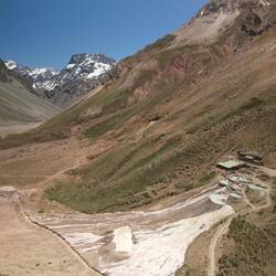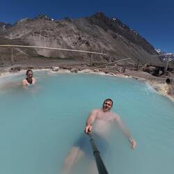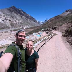 Unser erstes Ziel waren die heißen Quellen von Valle de Colina, welche im Cajón del Maipo liegen. Verantwortlich für das Austreten der heißen Quellen ist der Vulkan San José. Das Wasser durchläuft mehrere natürliche Becken, ehe es wieder im Gestein verschwindet. Das oberste Becken, was wir nicht getestet hatten, soll eine Temperatur von 60°C besitzen. Über die verschiedenen Beckenstufen kühlt es sich auf bis circa 25°C ab. Die Badesachen waren schnell angezogen und beim Eintritt bekamen wir den Tipp uns langsam nach oben durchzuarbeiten aber wir wussten es besser um dann aber doch zeitnah wieder in ein kühleres Becken vorzuziehen. Die Beine nach oben treibend genossen wir die Kulisse. Das Wasser war milchig, hellblau und der Rand weiß von Mineralien. Wieder war keine einzige Wolke am Himmel und die massiven Felswände ragten in die Höhe, in weiterer Entfernung mit weiß bedeckten Gipfeln. Wir im mollig warmen Wasser, ließen die Beine nach oben treiben, genossen den Moment und so verging die Zeit wie im Flug (wobei unser letzter Flug nicht gemeint sein kann).