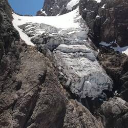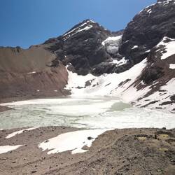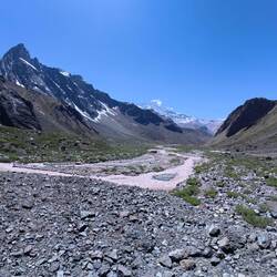 Ich war an der Schranke zum Nationalpark angekommen. Nach kurzer Rücksprache mit dem Park Ranger (der zum Glück Englisch konnte) ließ ich das Auto dort stehen und startete meine Wanderung von da. Mit drei Litern Wasser, einen Apfel und zwei Riegeln ging es los. Meine Drohne hatte ich auch dabei und die Erlaubnis vom Park Ranger war eingeholt. Die erste Strecke ließ die Höhenmeter etwas schwinden aber war ansonsten unattraktiv. Der Weg führte gerade nach oben und umging die Serpentinen, welche die Autos nehmen mussten. So kreuzte ich die Straße um das ein oder andere Mal und war froh, als der Teil hinter mir lag. Nun führte ein Schotterweg stetig nach oben und bot die ersten Eindrücke vom umliegenden Felsmassiv, welches in den verschiedensten Farben zur Geltung kam, ocker, grün, braunrot, sind nur ein paar. Der nächste Abschnitt war sehr gediegen, leichte Steigung bei einem guten Weg, ließ die Wegstrecke dahinschmelzen. Das Tal, in dem ich lief war etwas breiter und ein Bach brauste von den oberen Schneefeldern nach unten. Ein paar wilde Pferde standen auf der Wiese und schauten mich verdutzt an, denn andere Leute suchte man vergebens. Die ersten sah ich erst viel später und außer der Gruppe war ich immer allein unterwegs. Die Pferde scheinen hier auch eine beliebte Alternative zum Auto zu sein. Bereits gestern fuhren wir an ein paar Reitern vorbei und als wir gestern von der Unterkunft zum Auto liefen, verliesen gerade drei Leute ein Lokal auf ihrem Pferd. Ich versuchte mein Tempo zu halten, denn die Info vom Park Ranger war, dass der Nationalpark zwischen 18Uhr und 19Uhr geschlossen wird. Nachdem die sachte Passage sich dem Ende näherte und das Tal in einer leichten Rechtskurve die ersten Blicke auf die schneebedeckten Gipfel freigab, wurde das Terrain steiniger und unbequemer. Die Steigung nahm zu und permanent drückte die Sonne von oben. Man hatte ja den ersten Sonnenbrand aber an was hatte man nicht gedacht, ein Langarmshirt oder vielleicht eine Sonnenbrille? Zudem gab es weit und breit keinen Schatten, erst weiter oben nutzte ich einen größeren Felsbrocken als Schattenspender. Die ersten Schneefelder lagen hinter mir und der Abschlussanstieg, welcher nochmal ein paar Höhenmeter abverlangte, war geschafft, auch wenn das Tempo sehr darunter gelitten hatte. Vor mir erstreckte sich nun der Gletschersee und der Gletscher selbst hing weiter oben zwischen zwei Bergspitzen. Ein paar Wasserfälle schossen nach unten und das umliegende Bergpanorama war sehr beeindruckend. Viel Zeit zum Genießen gönnte ich mir nicht, denn ich wollte zeitnah aus der Sonne raus und zum anderen noch Zeit mit Caro verbringen.