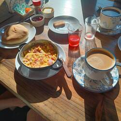 Das Frühstück hatten wir für halb neun geordert und es war sehr lecker. In einer kleinen Pfanne, total verbeult, gab es Rührei mit Schinken und Käse, dazu ein selbstgebackenes Brötchen und leckeren Kaffee. Das war schonmal ein guter Start in den Tag, mit schönem Ausblick auf das benachbarte Bergmassiv. Die geplante Tour verlief im benachbarten Tal und führte über eine Route von circa 18km und 1000Hm zu einem kleinen Gletschersee. Bei der Hitze und Caros Zustand wäre das für den Genesungsprozess nicht wirklich förderlich gewesen.