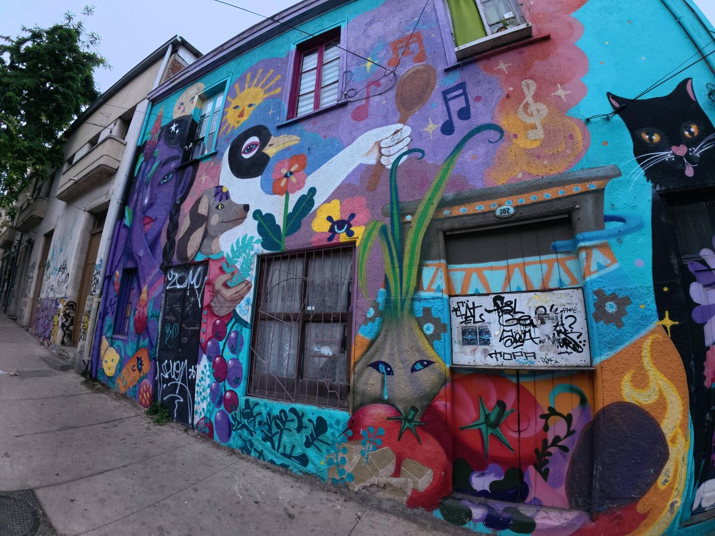 Chaotisch aber schön, passt heute zu mehreren Themengebieten. Das eine ist ganz klar die Stadt Valparaiso. Der Verkehr, die angelegten Straßen, die gebauten Häuser und vieles mehr. Alles läuft hier etwas anderes. Unsere Gastgeberin hat schon zum Anfang gemeint, entweder man liebt es oder hasst es, wobei wir uns mittendrin einsortieren würden. Die vielen künstlerischen Gemälde, ob die Leinwand ein Haus, der Boden, eine Treppe ist, selbst Hundehütten oder rausragende Rohre sind davor nicht sicher. Wir hatten heute nochmal Zeit bis 15Uhr die Stadt auf ein weiteres zu erkunden. Begonnen haben wir mit dem alten Gefängnis, welches keines mehr ist. Von außen sieht man die hohen Gefängnismauern, die mitten in der Stadt nach oben ragen. Im Inneren steht noch ein altes großes weißes Gebäude mit vergitterten Fenstern. Statt dies dem Verfall zu überlassen, wurde es komplett entkernt und viele Studios integriert, sowie ein kleiner Sportbereich. Als wir gerade hindurchschlenderten sahen wir ein Töpferkurs, andere gingen mit Instrumenten in einen Raum. Der Platz hinter dem Gebäude zu den Mauern hin wurde in eine grüne Oase umgestaltet. Danach machten wir uns in den flacheren Bereich auf, der das ein oder andere imposante Gebäude beheimatete aber die Ansehnlichkeit sichtbar nachgelassen hatte. Unser Weg führte uns nochmal zu der steilen Straße, welche wir bei unserer Ankunft hochgefahren waren und ja, es war nicht nur das Gefühl im Auto gewesen. Heute ist Sonntag, dass merkt man auch in der Stadt, sowie hier, denn die menschliche Ampel hat ihre Arbeit noch nicht wieder aufgenommen. Der Stadtteil unter unserer Unterkunft war somit auch erledigt und wir mit Sinneseindrücken überflutet. Da wir noch Zeit hatten suchten wir uns noch ein nettes Café mit Blick über die Stadt und genossen den Vormittag. Heute war besseres Wetter, die Aussicht war demzufolge sehr gut. Kurzes Fazit zur Sicherheit: Wir haben uns zu keiner Zeit unsicher gefühlt aber haben uns an die Tipps gehalten und bestimmte Bereiche gemieden.