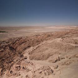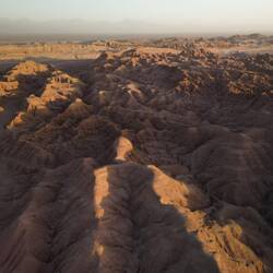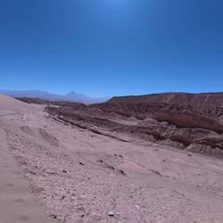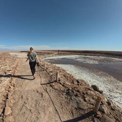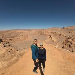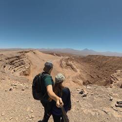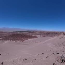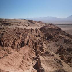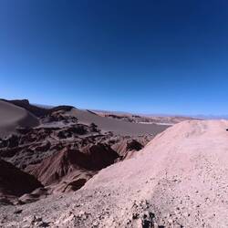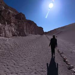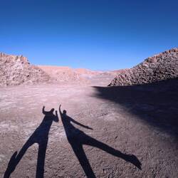 Eigentlich stand heute eine weitere Fahrt ins Hinterland der Atacama Wüste an aber wir hatten beide gestern bereits gemerkt, dass die letzten Tage uns mit Eindrücken derart überflutet haben, dass wir mal eine Auszeit bräuchten bzw. einen nicht so stressigen Tag. Daher ging es heute gemütlich zum Frühstück, brachten danach unsere Wäsche zum Wäscheservice, was per Express 28€ kostete (5kg). Ohne Express wäre es gerade mal 5€ weniger gewesen. Danach ging es ins Valle de la Muerte. Der Nationalpark war ähnlich wie der gestrige, deutlich kleiner aber mit einer längeren Wanderung. Die Schlucht, welche man hindurchfuhr war an vielen Stellen enger aber die Aussichtspunkte weitläufiger. Um die Zeit war so gut wie nix los und wir konnten entspannt die Natur (Steine und Sand) genießen. Zuerst ging es einen steinigen, sandigen Weg mit sachter Steigung nach oben, von da aus konnte man über die Hochebene und Salzflecken schauen. Auch bot der Aussichtspunkt einen guten Ausblick auf San Petro de Atacama. Der Rückweg führte in einem Bogen auf dem Grad des Felsmassivs fort. Wir liefen quatschten und orientierten uns an zwei Französinnen, welche in geringer Entfernung vor uns liefen. Der Weg kam uns langsam etwas lang vor und der Parkplatz geriet in weite Ferne. Ein paar Spuren verrieten, dass an dem Punkt schon welche die Düne runter sind. Wir blieben stehen und die beiden Mädels kamen auch zurück. Wir entschieden die Düne hinab zu gehen, wobei die Französinnen nur Sandalen anhatten. Wir konnten es nicht nachvollziehen aber das sollte sich schnell ändern. Wie wir die Düne herunterliefen, kroch der heiße Sand an die freien Bereiche unsere Beine und das brannte verdammt stark. Durch kleine Pausen konnten wir den Schmerz immer wieder ein wenig abklingen lassen, ehe wir die nächsten Meter machten. S arbeitete wir uns langsam vorwärts. War natürlich super für einen ruhigen Tag, mit anschließender Wegstrecke im sandigen Bereich. Am Auto gab es erstmal was zu trinken und den Sandkasten im Schuh mussten wir auch loswerden.