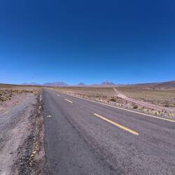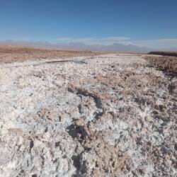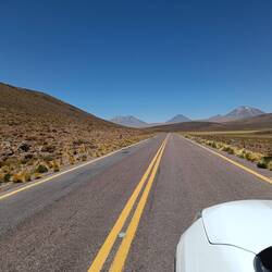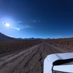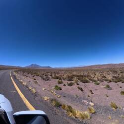 Heute stand eine längere Fahrt an. Von San Petro de Atacama ging es zu mehreren Nationalparks, der weit entfernteste Punkt war 150km entfernt. Trotz Weckers waren wir etwas spät dran und hatten gerade vollgetankt. Die Tickets haben wir bereits in der Unterkunft online gebucht und alles was wir brauchten befand sich im Auto. Nun ging es quer durch die Atacama Wüste. Im ersten Abschnitt fuhren wir eine Ebene entlang, wo am Horizont etwas verschleiert die Hügelketten erkennbar waren. Die Straße ging geradeaus und verschwand am Horizont. Rechts von uns waren bereits weiße Bereiche in der Ferne erkennbar, die zu Lagunen gehörten, wo sich Salz abgelagert hatte. Diese ewige Weite ist schwer zu beschreiben und kaum fassbar. Selbst die Bilder können es nicht ansatzweiße rüberbringen. Dazu die aneinandergereihten Vulkane welche sich majestätisch emporhoben. Das Farbspiel war ebenfalls bemerkenswert. War die Wüste noch vor kurzem grau und staubig, verwandelte sie sich in kurzen Augenblicken mit gelben Grasbüscheln in verschiedenste Ockertöne, das Gestein in diverse Rottöne und der blaue Himmel von oben. Um den ungewöhnlichen noch die Krone aufzusetzen hörten wir in der Wüste Weihnachtslieder „Let it snow, let it snow, let it…“. Ich mein hier kannst du auch weiße Weihnachten haben, ist dann halt eher salzig…