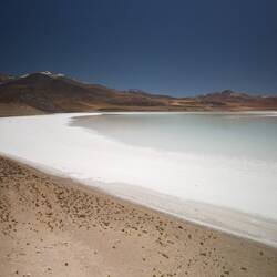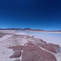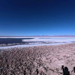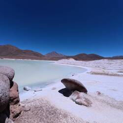 Zum späten Nachmittag schmissen wir uns ins Badeoutfit. Eine halbe Stunde entfernt gab es eine Lagune, welche auch zum Baden genutzt werden konnte. Wir hatten uns im Vorfeld aber zu wenig damit beschäftigt, sodass wir hier leider keinen Platz mehr fanden. Die Nachmittage sind für die Reiseagenturen reserviert und so mussten wir 11km weiterfahren. Da war eine weitere Lagune aber nur zum Beobachten aus der Ferne. Imposant war sie, trotz der vorangegangenen Lagunen. Das türkise Wasser und die große weiße Salzfläche in der Umgebung waren sehenswert. Hatten wir Am Vormittag die große Ebene von oben bestaunt, waren wir jetzt mittendrin. Flamingos sahen wir leider keine.
