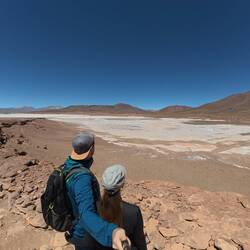 Unser erstes Ziel hieß Piedras Rojas, eine Lagune auf über 4000Hm über den Meeresspiegel, welche ein imposantes Farbspiel bot. Das rote Eisenoxid der Gesteinsformationen, der türkisfarbene See, sowohl die weißen Salzablagerungen verschaffen diesen Ort eine schillernde Erscheinung. Bevor wir jedoch diesen bestaunen durften, mussten wir unterwegs unser online Ticket in ein geschriebenes Ticket eintauschen und die Lagune selbst durften wir nur auf vorgeschriebenen Wegen und mit bestimmten Restriktionen bestaunen. Wir haben uns diesmal lang angezogen, da die Sonne hier sehr aggressiv ist und wir zudem nicht einen weiteren Sonnenbrand riskieren wollten. Außerdem pfeift hier ein kälterer Wind. Mit der Ankunftszeit hatten wir Glück, denn genau wo wir ankamen, waren so gut wie keine Touristenbusse vor Ort. Vom Parkplatz führte ein Rundweg zur Lagune, welcher circa eine dreiviertel Stunde dauerte. Wir schlenderten den Weg entlang aber merkten beide die Höhe, welche unserer Kondition zusetzte, zudem plagen uns beide immer noch Husten und Schnupfen. Während andere nur vorbeiliefen, versuchten wir die Stimmung aufzusaugen.